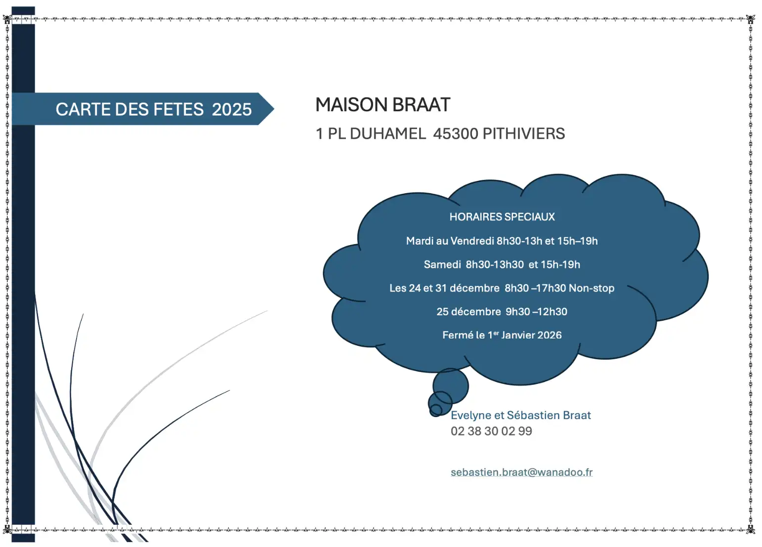 Pour le réveillon de Noël, les prises de commandes doivent être effectuées avant Samedi 20 Décembre.